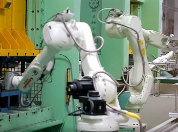 利用6軸機器人的柔性對不同產品的抓取,通過模塊化夾具,加快了生產換型和提高生產適應性。